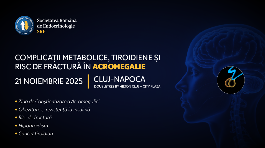 Societatea Română de Endocrinologie are plăcerea de a vă invita la evenimentul ştiinţific “Complicaţii metabolice, tiroidiene şi risc de fractură în acromegalie”, ce se va desfăşura la Cluj-Napoca, în data de 21 noiembrie 2025.